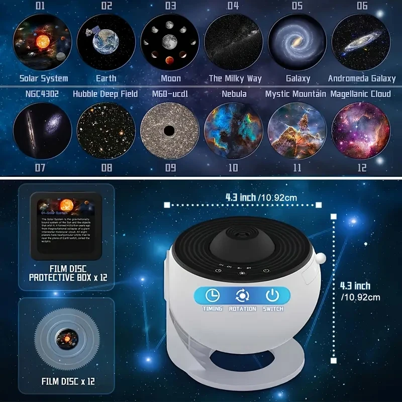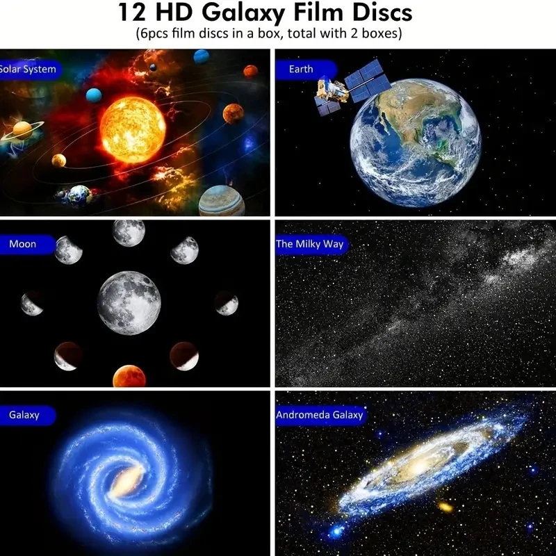 Este proyector de galaxias para dormitorio incluye 12 diapositivas temáticas: Sistema Solar, Tierra, Luna, Vía Láctea, Galaxia, Galaxia de Andrómeda, NGC4302-NGC4298, Campo Profundo del Hubble, M60-UCD1, Nebulosa de América del Norte, Montaña Mística y Nube de Magallanes.
